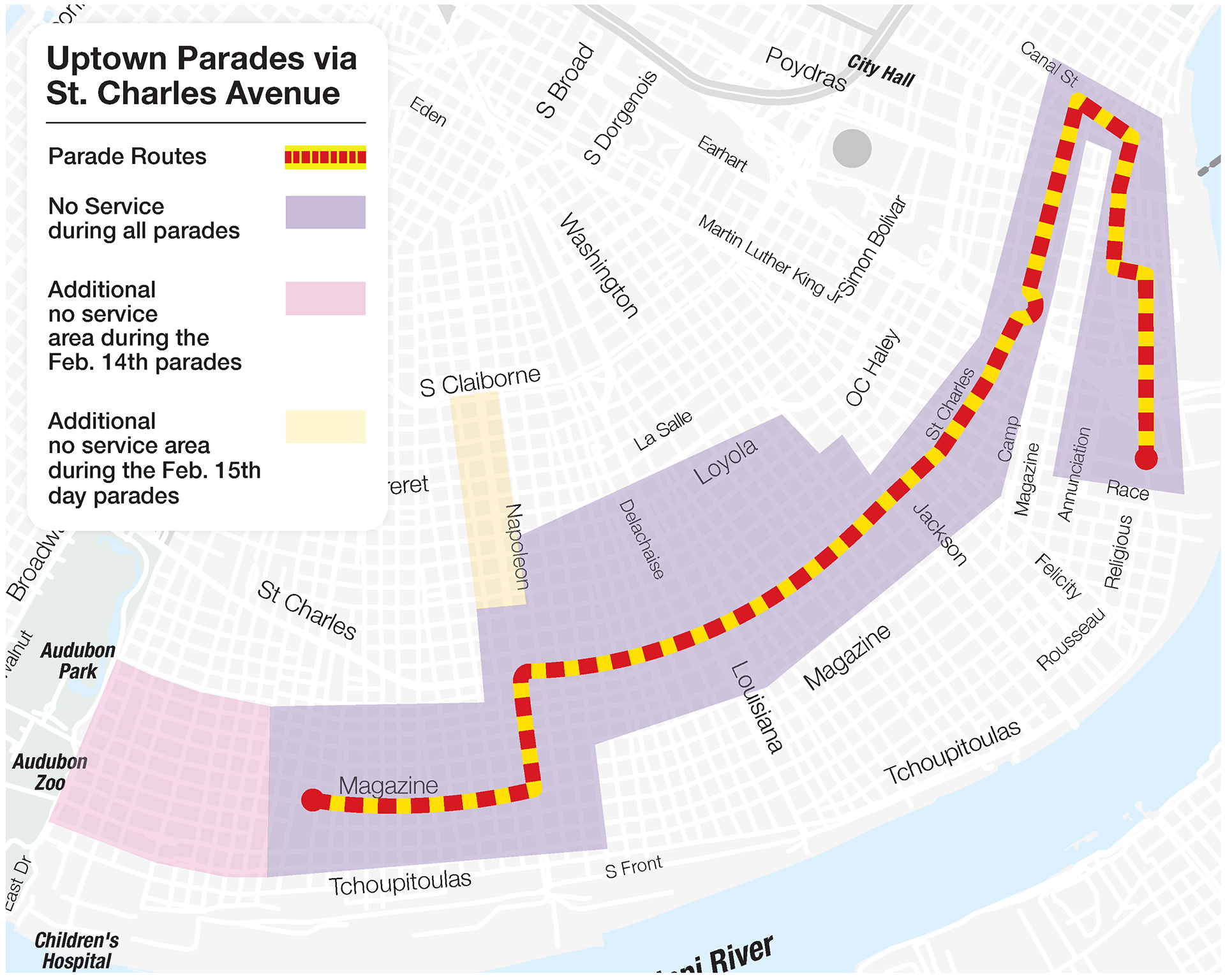 | Routes 31, 32 and 11 will have no service to Children’s Hospital. Route will stop at Audubon Park/Zoo. |