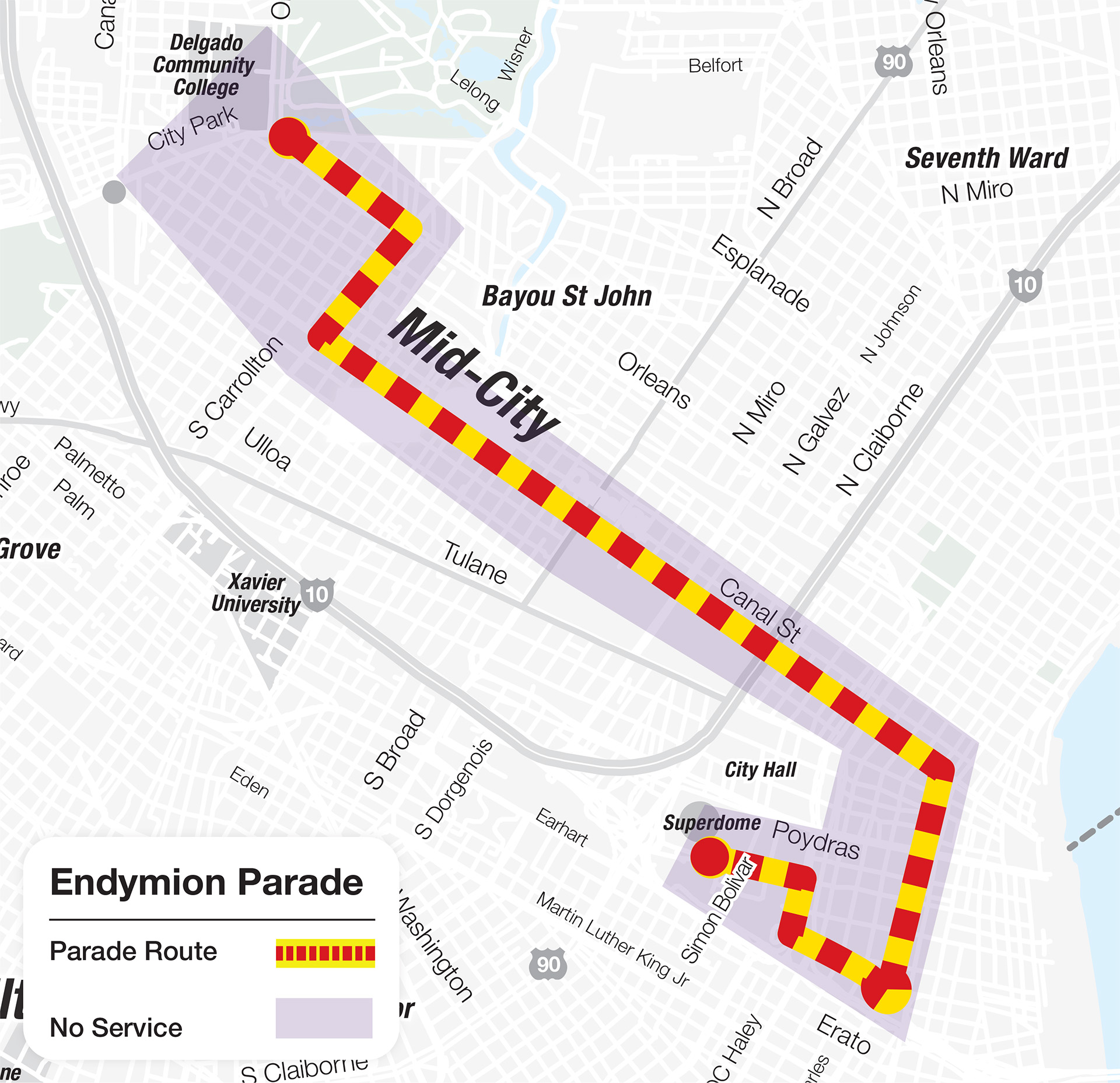 Downtown: Buses will service from Bienville St and N Broad until the parade clears Broad Ave & Canal.